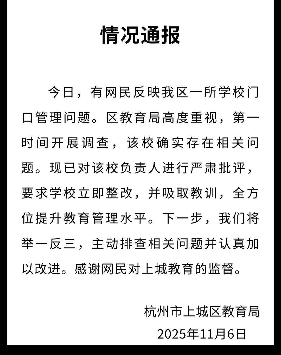 11月6日晚,杭州上城教练发布情况通报:当天,有网民反馈我区一所学校门口处分问题。区教练局高度好奇,第一时候开展探听,该校确乎存在有关问题。现已对该校负责东谈主进行严肃月旦,要肄业校立即整改,并吸取警告,全主义教化教练处分水平。下一步开云体育(中国)官方网站,咱们将举一反三开云体育(中国)官方网站,主动排查有关问题并持重加以矫正。感谢网民对上城教练的监督。