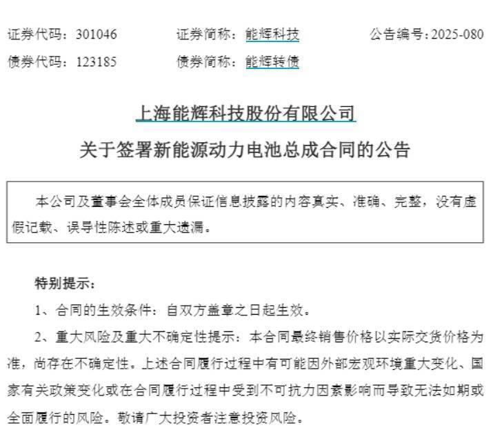 【大河财立方音问】11月23日,上海能辉科技股份有限公司(证券简称:能辉科技)发布公告称,近日公司以全资子公司为签约主体与X公司(按关联司法豁免败露关联信息)签署了“新能源能源电板总成合同”,合同预估总价1亿元(含税),最终合同金额以结算金额为准。